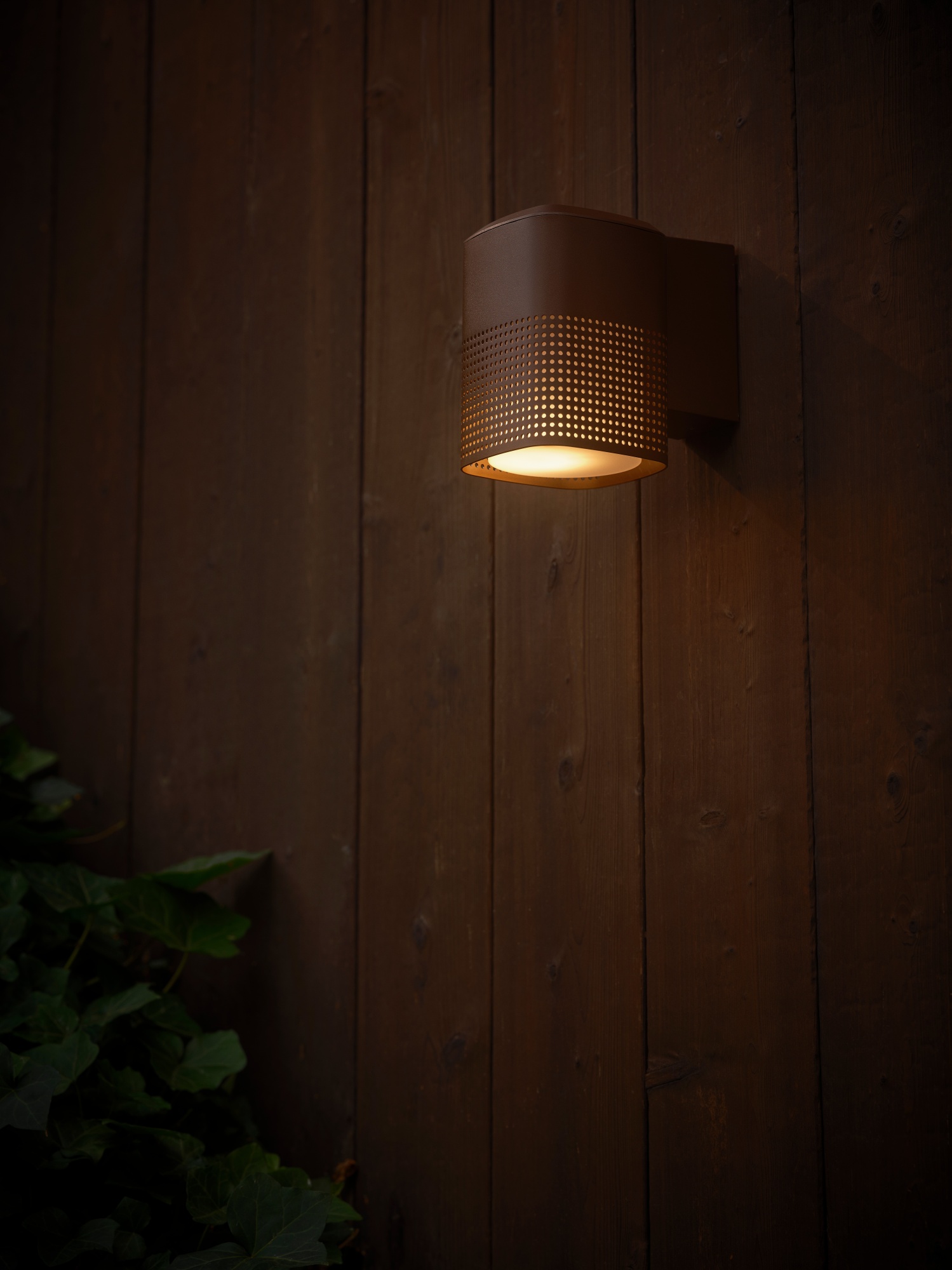 Sidara væglampen fra Nordlux er en elegant og funktionel løsning til udendørs belysning. Lampen er udført i et slidstærkt materiale med en flot metallisk brun finish, der komplementerer mange forskellige facadeudtryk.