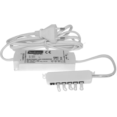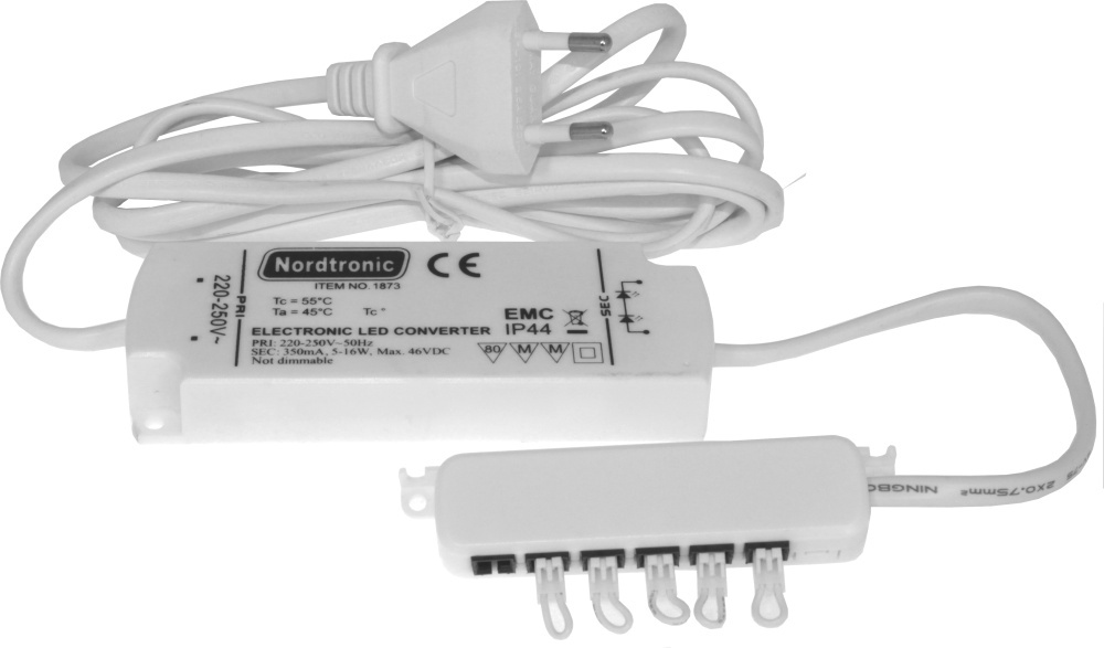 LED driver til Nordtronic kabinetspots/køkken LED-spots og mini downlight. Findes både som dæmpbar og ikke dæmpbar versioner. Leverer en konstant strøm på 350mA og har en maks. udgangsspænding på mindre end 60Vdc. Udgangspænding er variable, og stiger i takt med at driveren belastes mere (flere spot og ledninger tilsluttes).