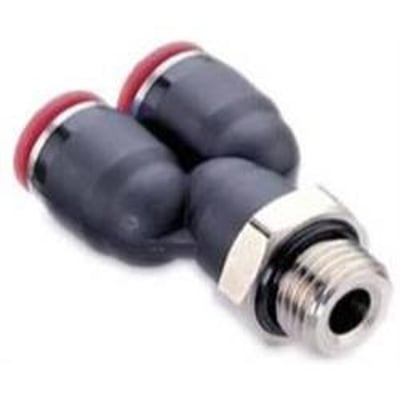 Pneumatisk Y-adaptor med vridbar nippel og rustfri spændering for sikker fastholdelse. Kompakt design med indespærret O-rings tætning, der sikrer en tæt og problemfri samling. Velegnet til arbejdstryk op til 10 bar.