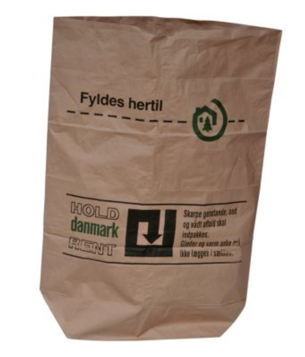 Brun papirsæk til affald, 70 x 110 cm og 110 liters volumen. Med teksten "Hold Danmark rent".