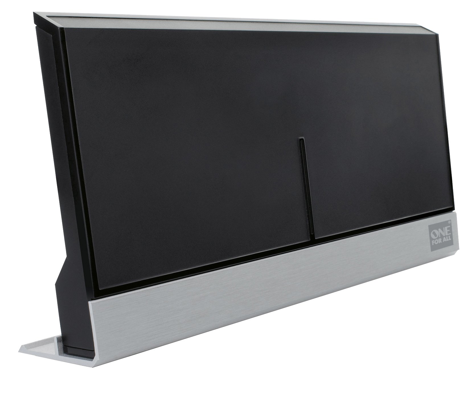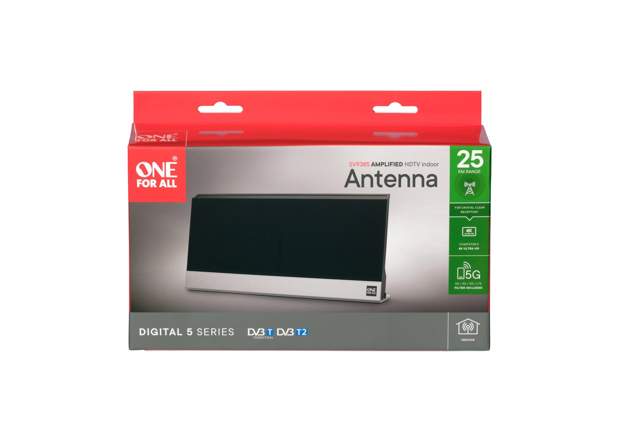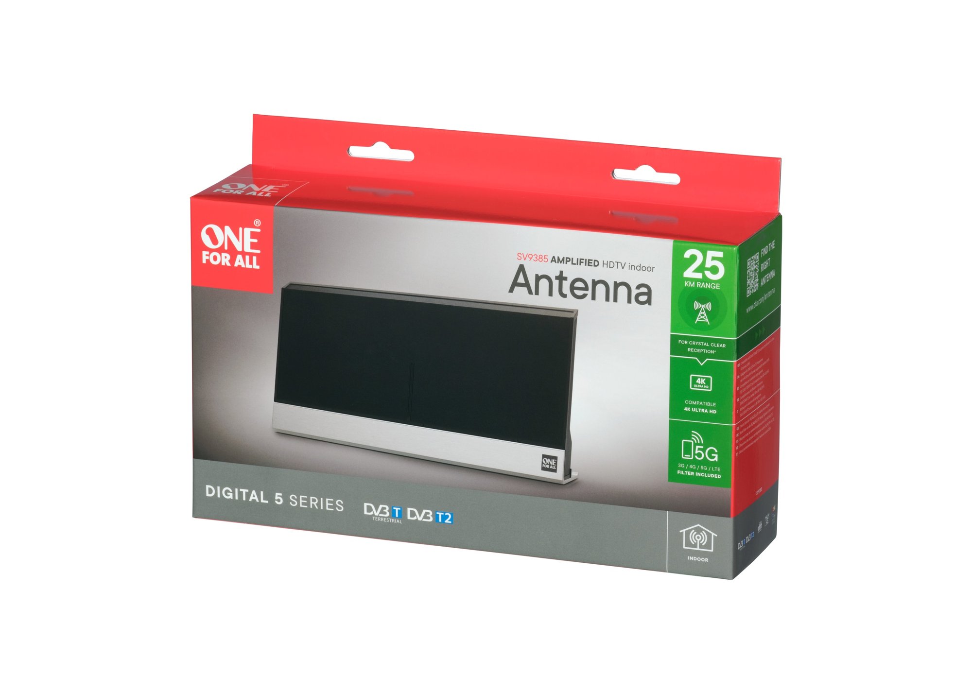 Indendørs antenne optimeret til fuld HD digitale TV-signaler. Kompatibel med DVB-T/T2 og udstyret med vidvinkelteknologi for forbedret modtagelse. Anbefales inden for 25 km fra senderen.