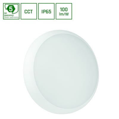 Vandtæt LED-armatur med justerbar farvetemperatur (CCT) på 230V. 18W, 1800lm, IP65. Robust PC-materiale, IK10.