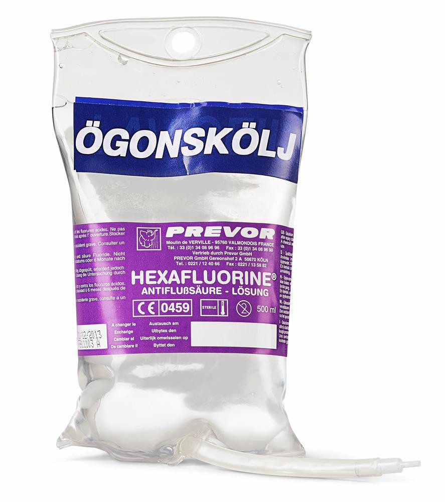 Hexafluorine flaske 500 ml til øjeblikkelig førstehjælp og neutralisering af flussyre i øjet. Minimerer skader ved start inden for 60 sekunder.
