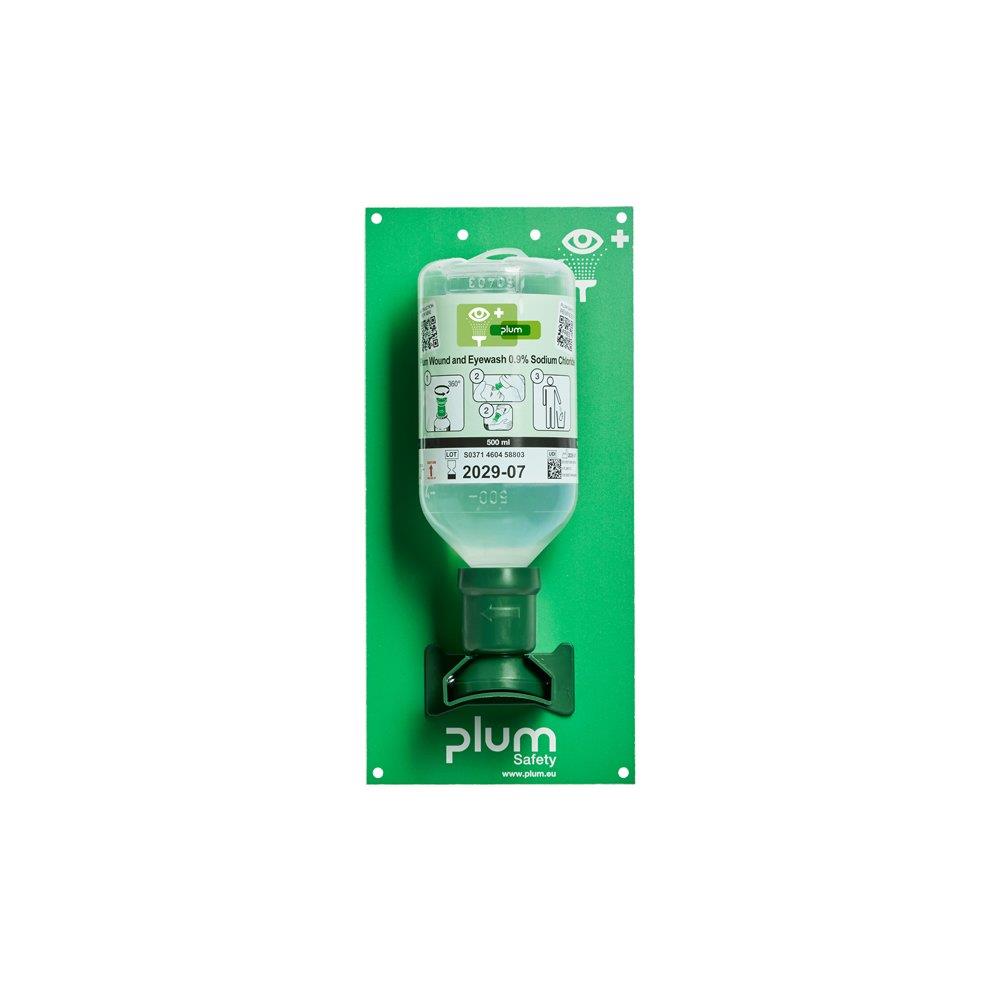 Vægmonteret åben station i hård plastik til hurtig førstehjælp ved øjen- eller sårskader. Indeholder 500 ml Plum sår- og øjenskyl.