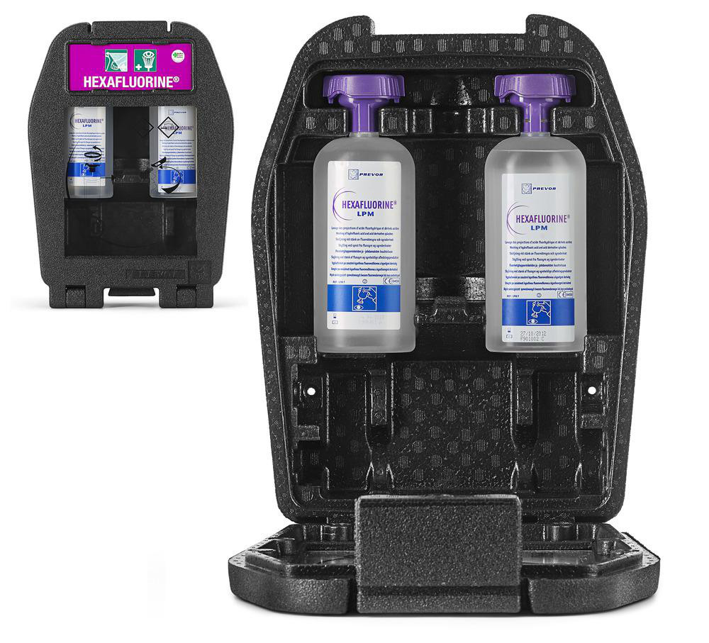Denne vægmonterede skylningsstation indeholder 2 x 500 ml Hexafluorine-flasker. Den er specielt udviklet til at neutralisere og skylle små mængder flussyre væk fra kroppen, og er særligt velegnet til brug i ansigtet og omkring øjnene.