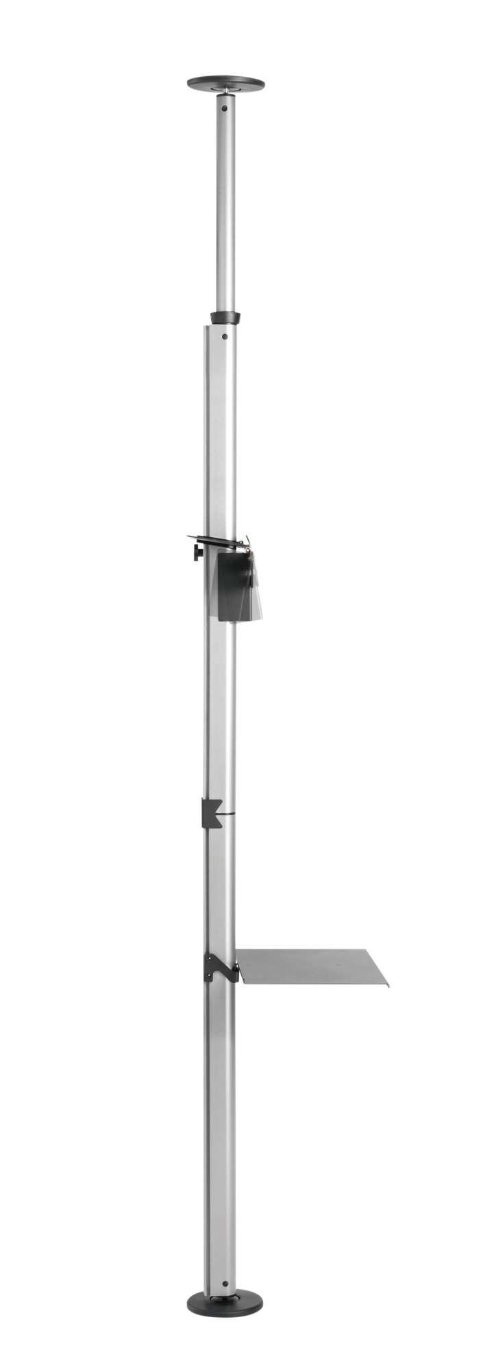 Gulv-til-loft beslag til skærme fra 37" til 70" med VESA-standarder op til 600x400. Understøtter op til 30 kg og inkluderer en integreret mediehylde.