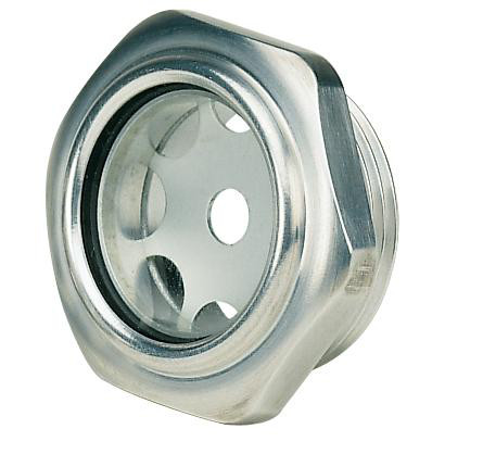 Wanner oliestandsglas med 6-kantet aluminiumshus og reflektorskive. Glasset er varmebestandigt op til +130°C og tryksikkert op til 10 bar.