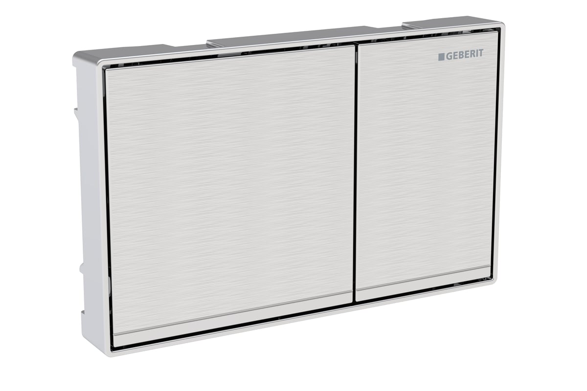 Geberit Omega60 betjeningsplade til dobbeltskyl. Square design med børstet krom finish og easy-to-clean overflade.