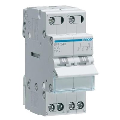 Denne 2-polede omskifter fra Hager er designet til afbrydelse af strømkredse og har en midterstilling (1-0-2). Den er dimensioneret til 2x40A og 230VAC.