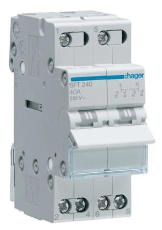 2-polet omskifter fra Hager med 40A, beregnet til 230VAC og med midterstilling 1-0-2. Til afbrydelse af strømkredse.