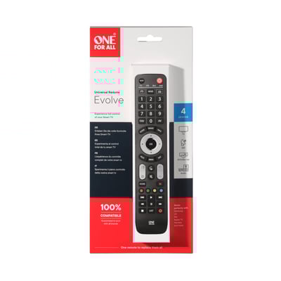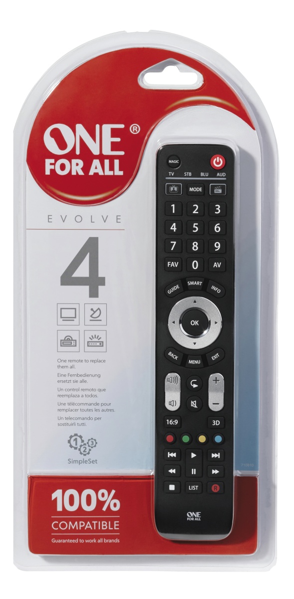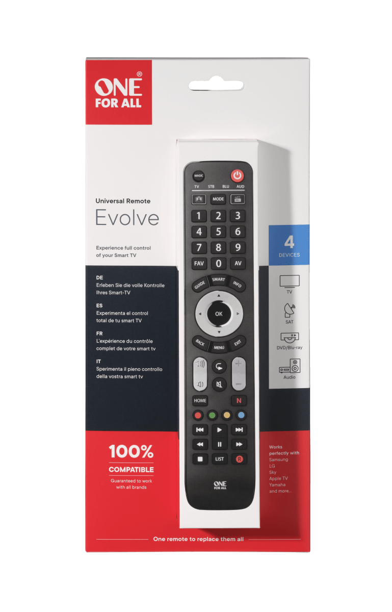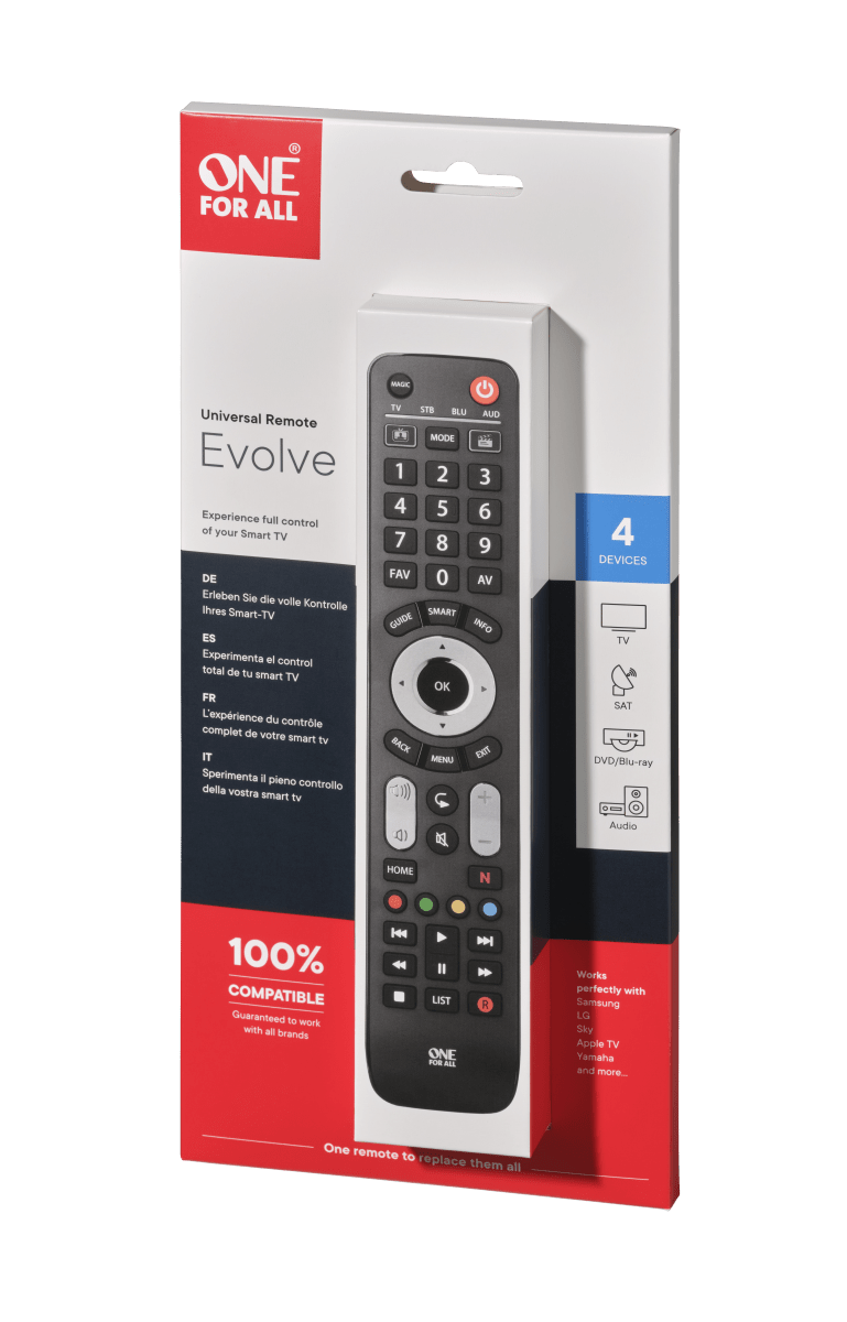 Den universale fjernbetjening Evolve 4, URC 7145, er designet til at forenkle din underholdningsopsætning ved at samle styringen af op til fire forskellige enheder i én praktisk fjernbetjening. Du kan nemt styre dit TV, din kabel-/satellit-boks, Blu-ray/DVD-afspiller og lydsystem uden at skulle skifte mellem forskellige enhedstilstande.