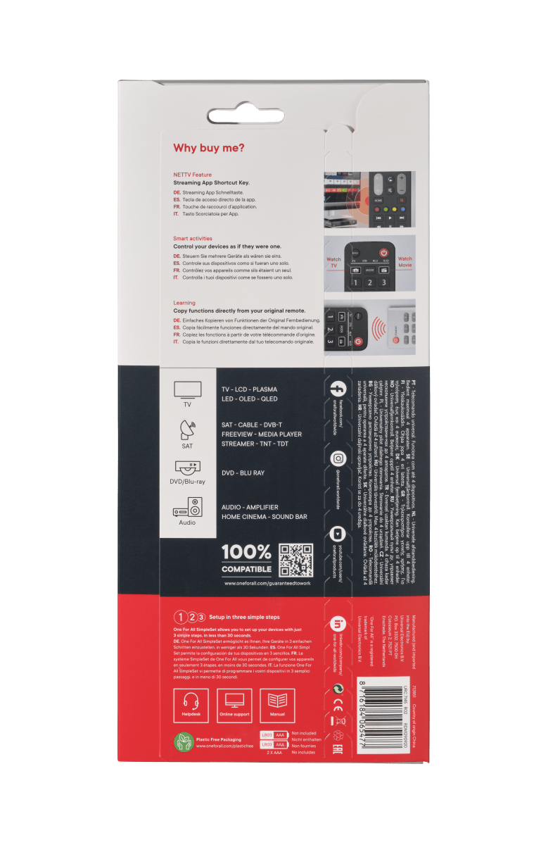 - Styr op til fire enheder: TV, kabel-/satellit-boks, Blu-ray/DVD og lydsystem.