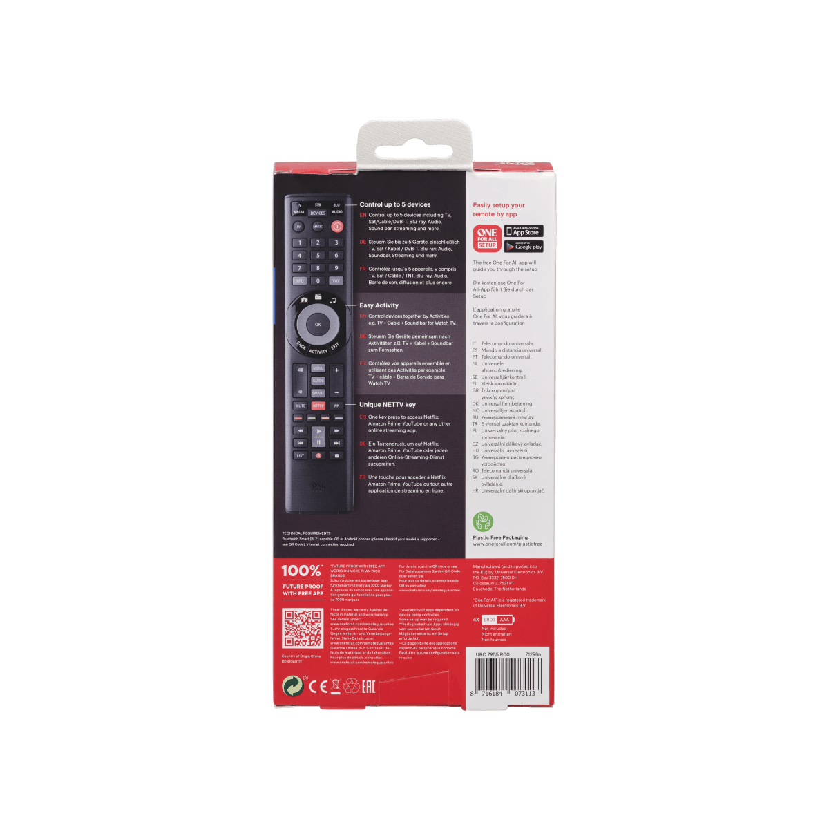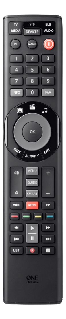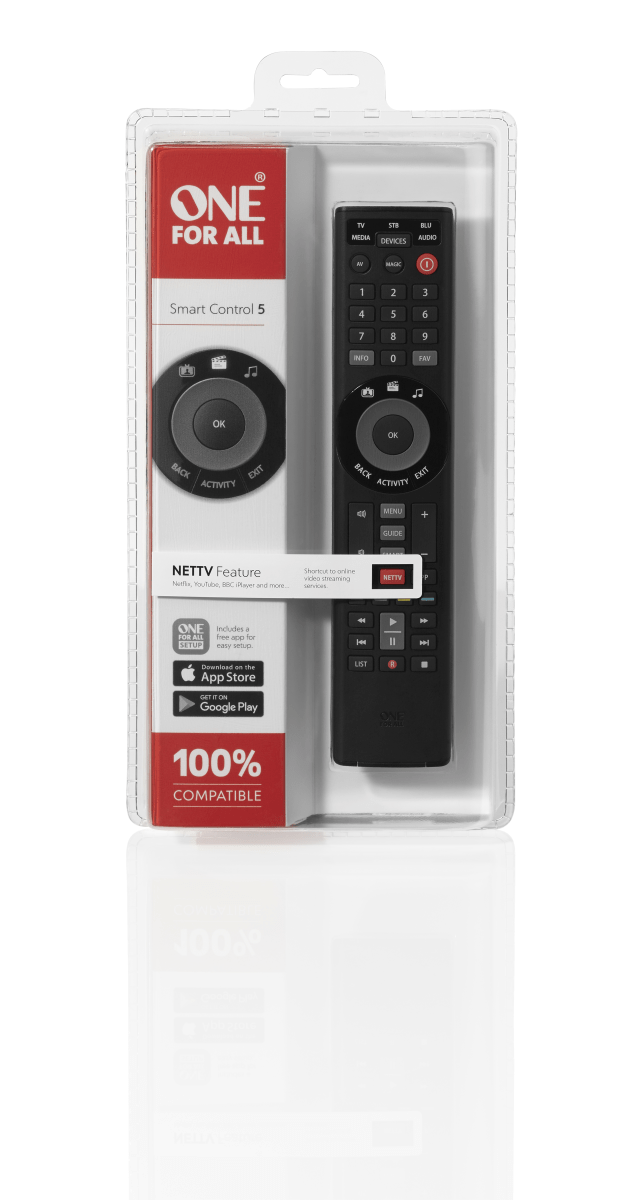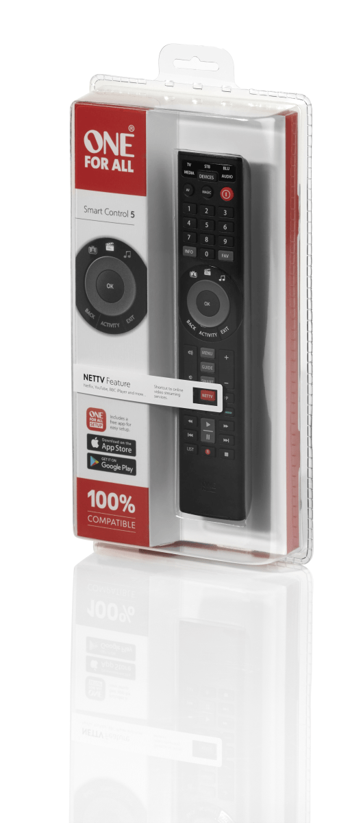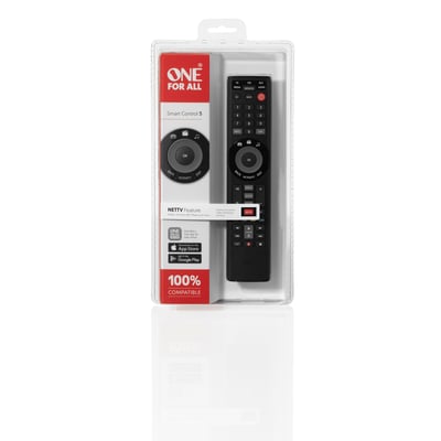 One For All Smart Control 5, URC 7955, er en alsidig universal fjernbetjening, der giver dig mulighed for at styre op til fem forskellige enheder i dit hjem. Med denne fjernbetjening kan du nemt konsolidere styringen af dit TV, soundbar, medieafspiller og andre enheder i én enkelt fjernbetjening.