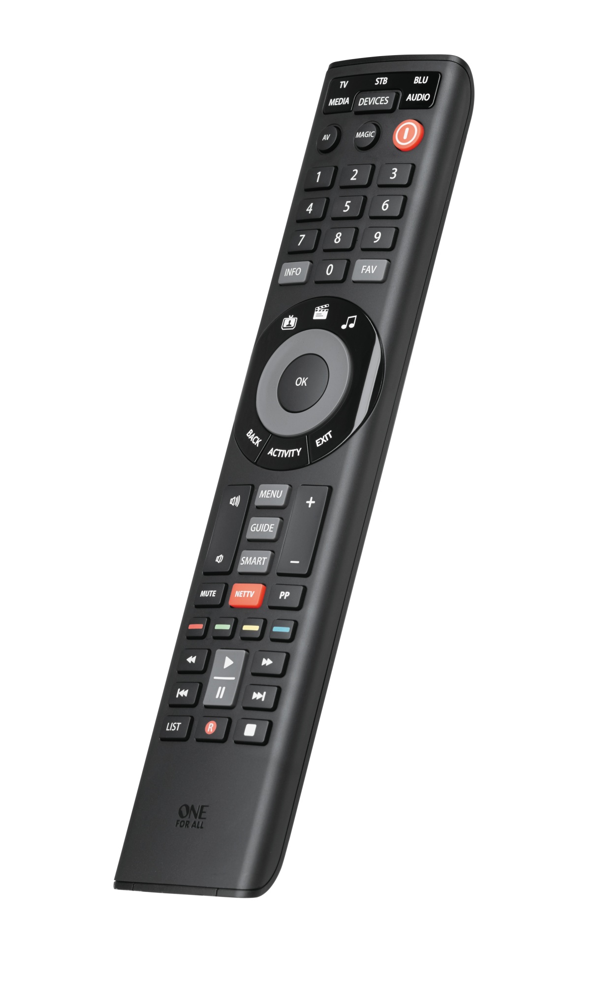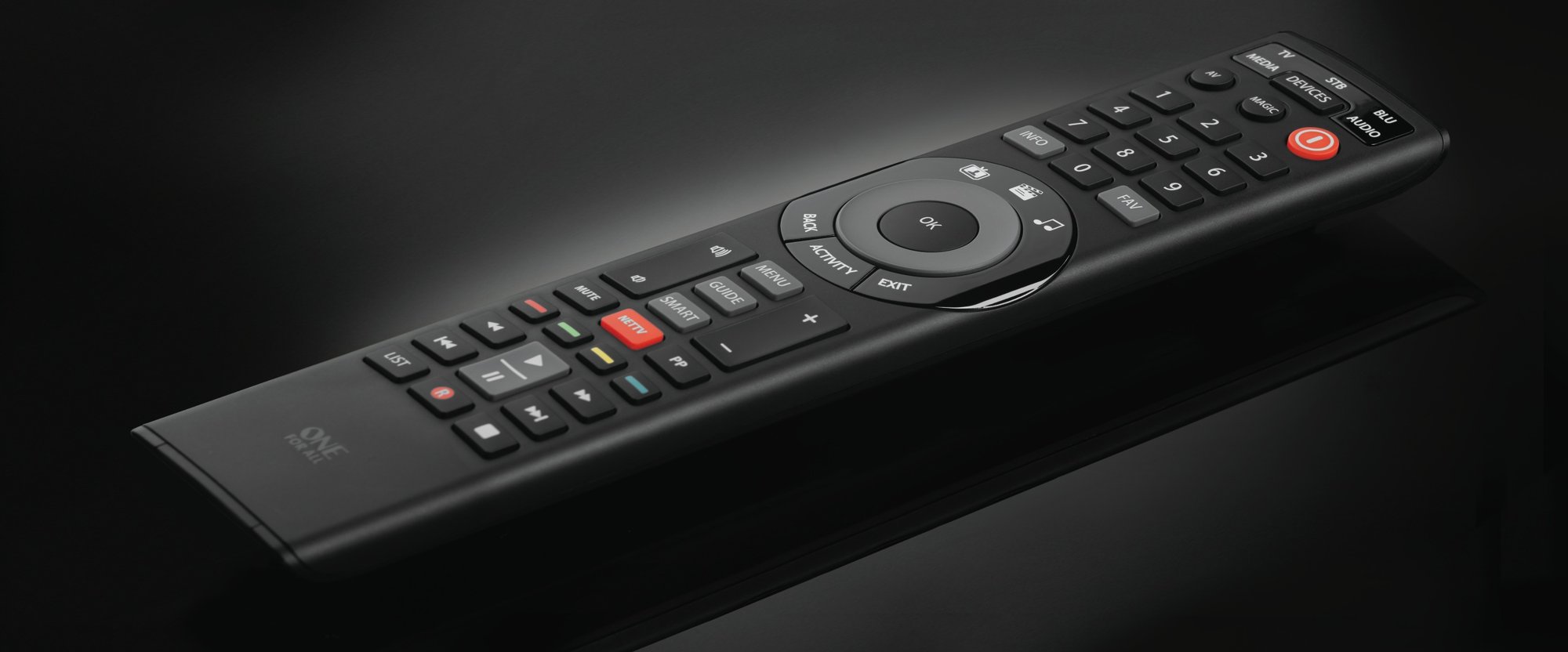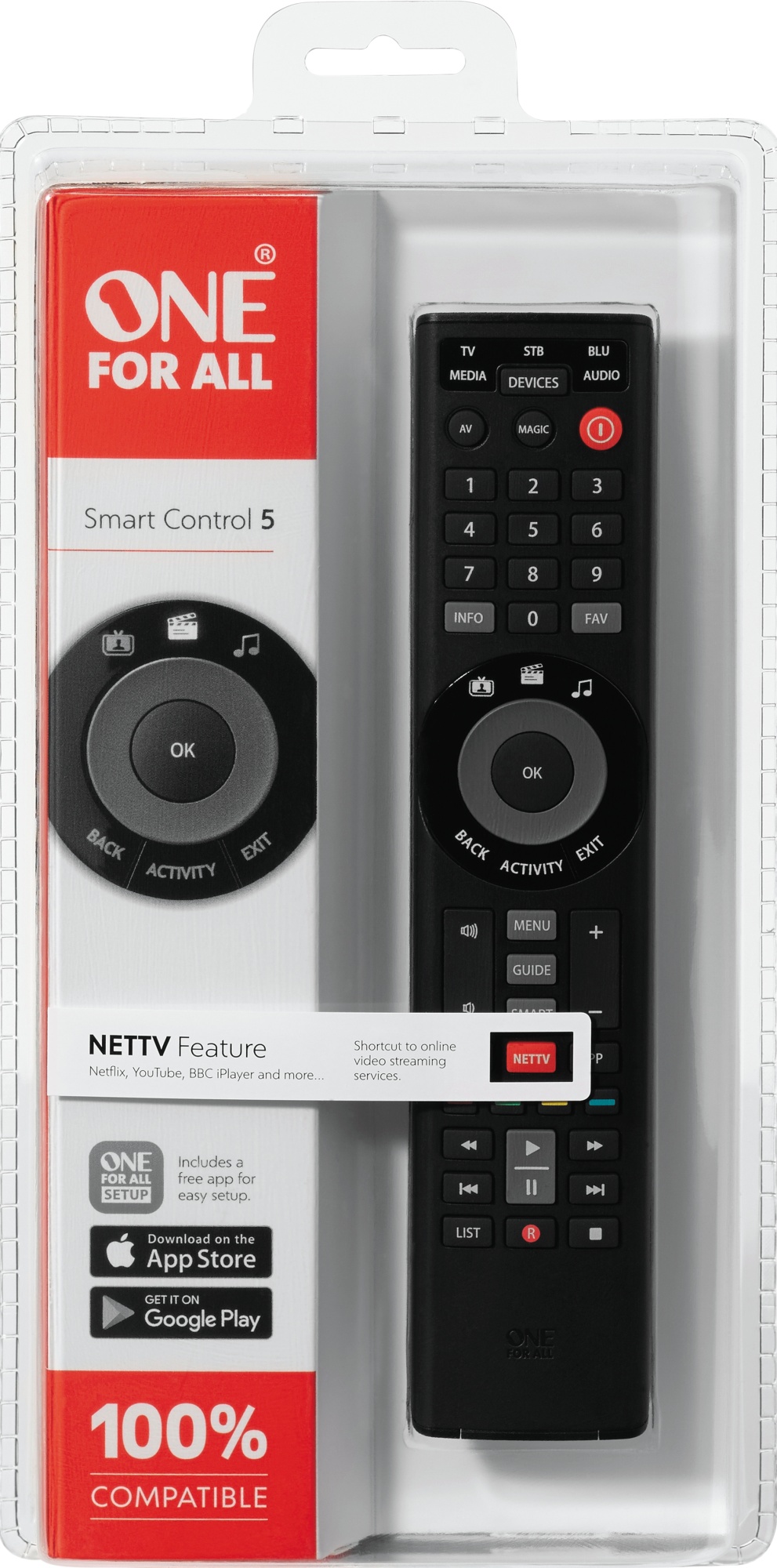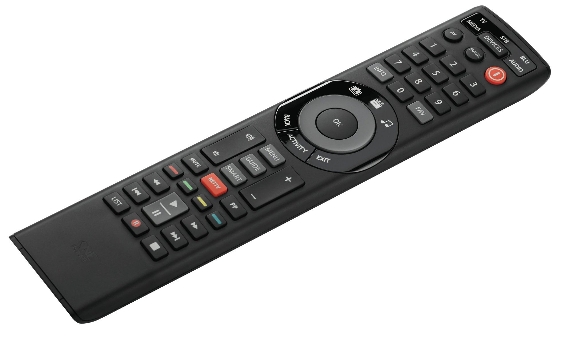 Smart Control 5 er designet til at gøre din underholdningsoplevelse mere strømlinet og bekvem. Den inkluderer en dedikeret NETTV-knap, som giver hurtig adgang til streamingtjenester, samt tre smarte aktivitetstaster, der kan programmeres til at udføre en række funktioner med et enkelt tryk.