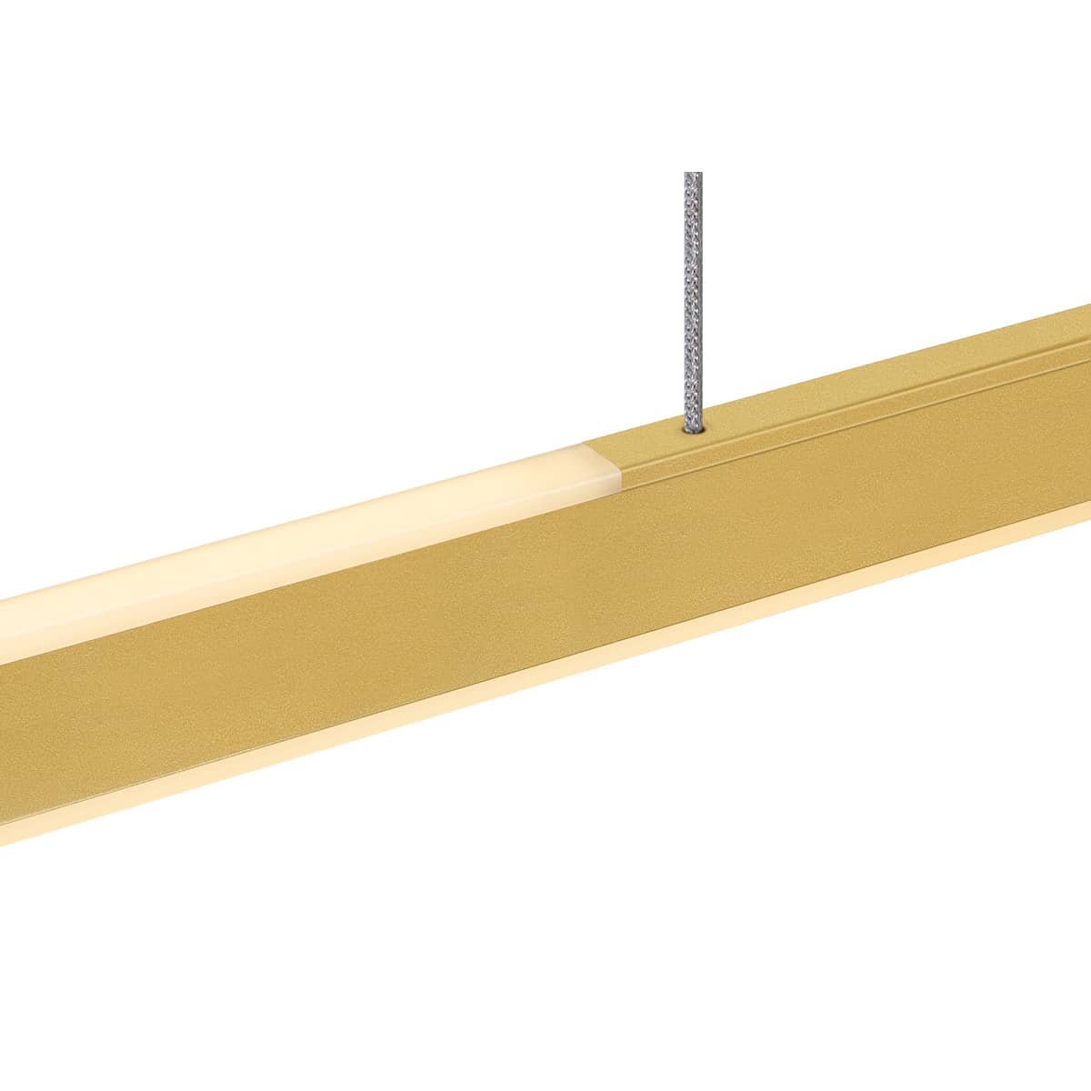 ONE LINEAR 100 pendel i messing. Lampen har et kompakt og moderne design, der passer ind i ethvert miljø. Justerbar lysfarve og mulighed for videresløjfning.
