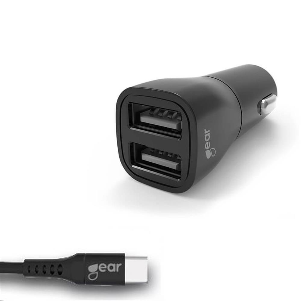Kompakt 12V oplader med to USB-A porte og 3,4 A. Inkluderer overspændingsbeskyttelse og USB-A til USB-C kabel.