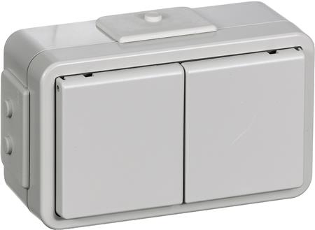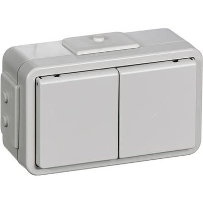 Dobbelt stikkontakt fra LK OPUS 73, designet til vådrum og udendørs brug. Med lys og jordtilslutning, IP44-klassificeret.