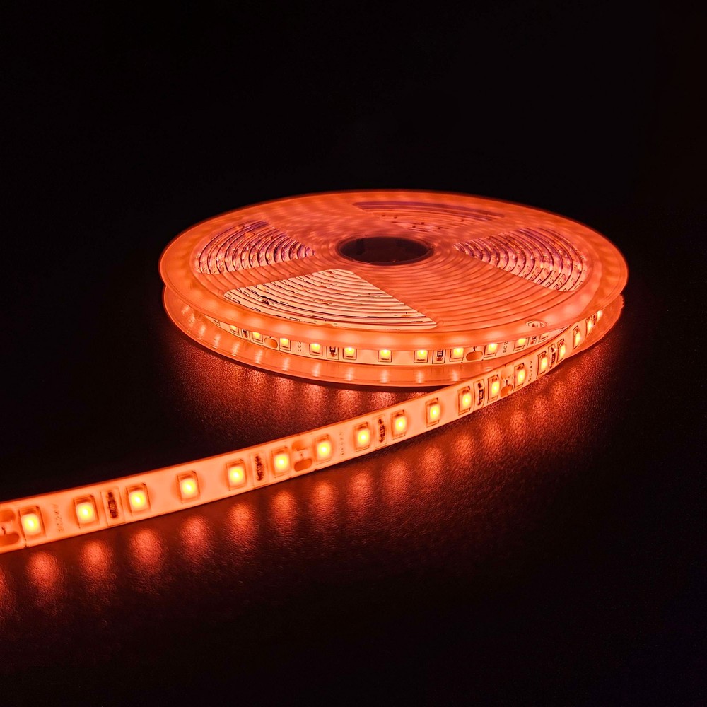 Fleksibel LED strip på 5 meter med 120 LED/meter. 10W/m, 24V DC, IP65, orange lys. Dæmpbar.