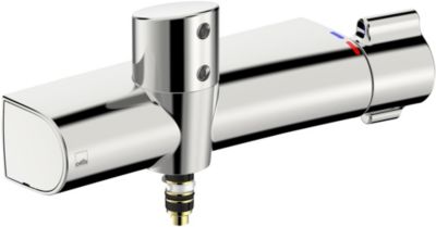 Berøringsfrit Oras Clinica håndvaskarmatur i krom med 6V Bluetooth-funktion, vægmontering og skoldningsspærre. Fremstillet i messing.