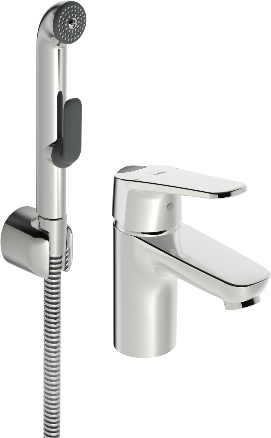 Håndvaskarmatur med Bidetta håndbruser og Eco funktion. Begrænser vandmængde og temperatur med Eco-knap. Inkl. 1750 mm slange og vægholder.