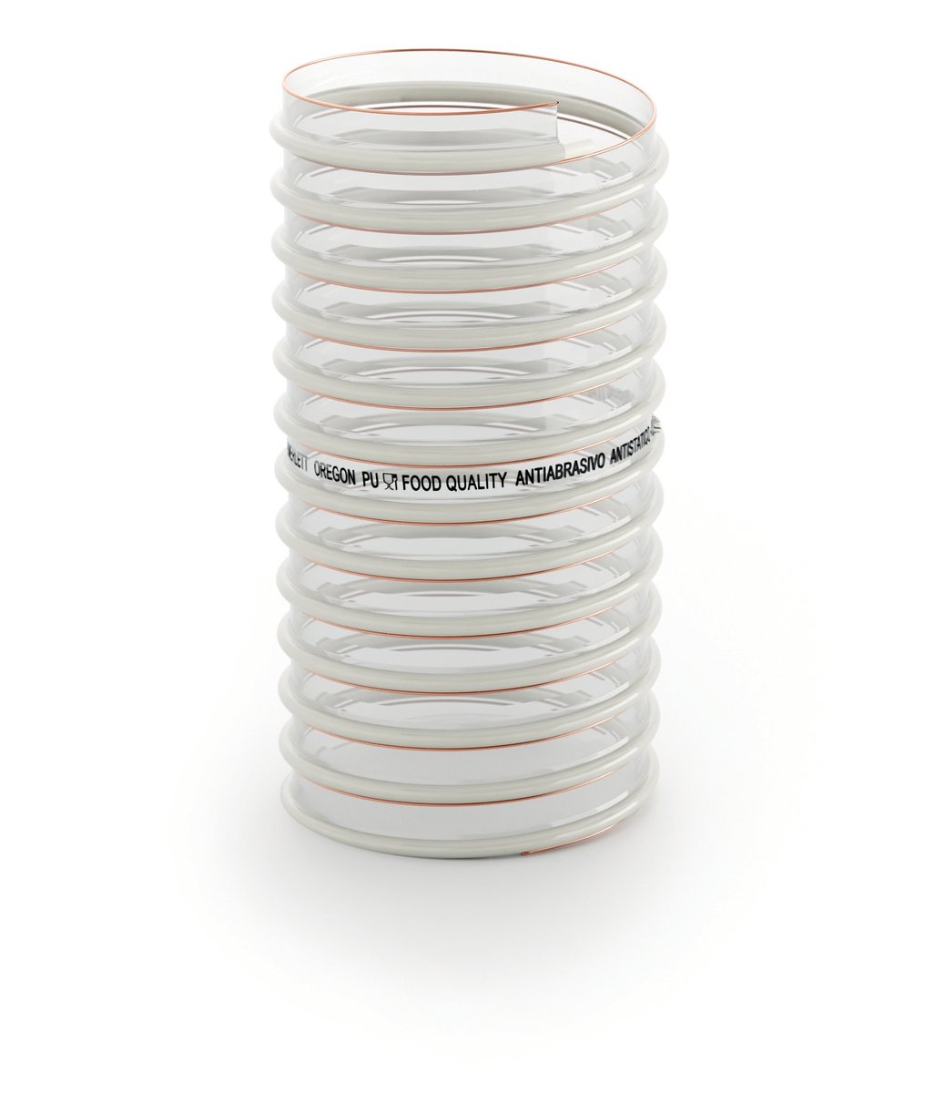 Polyurethane PU polyether slange med hård PVC spiral og kobbertråd. Til sug og tryk af slibende materialer og tørre levnedsmidler. Leveres direkte fra producenten.