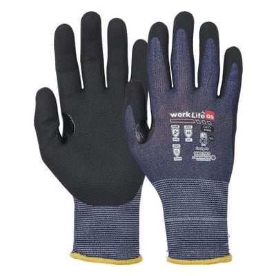 Worklife Cut C Plus handske med skærehæmmende UHMVPE/glasfiber-strik og foam-nitril belægning. Forstærkning mellem tommel- og pegefinger samt touchskærmfunktion.
