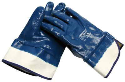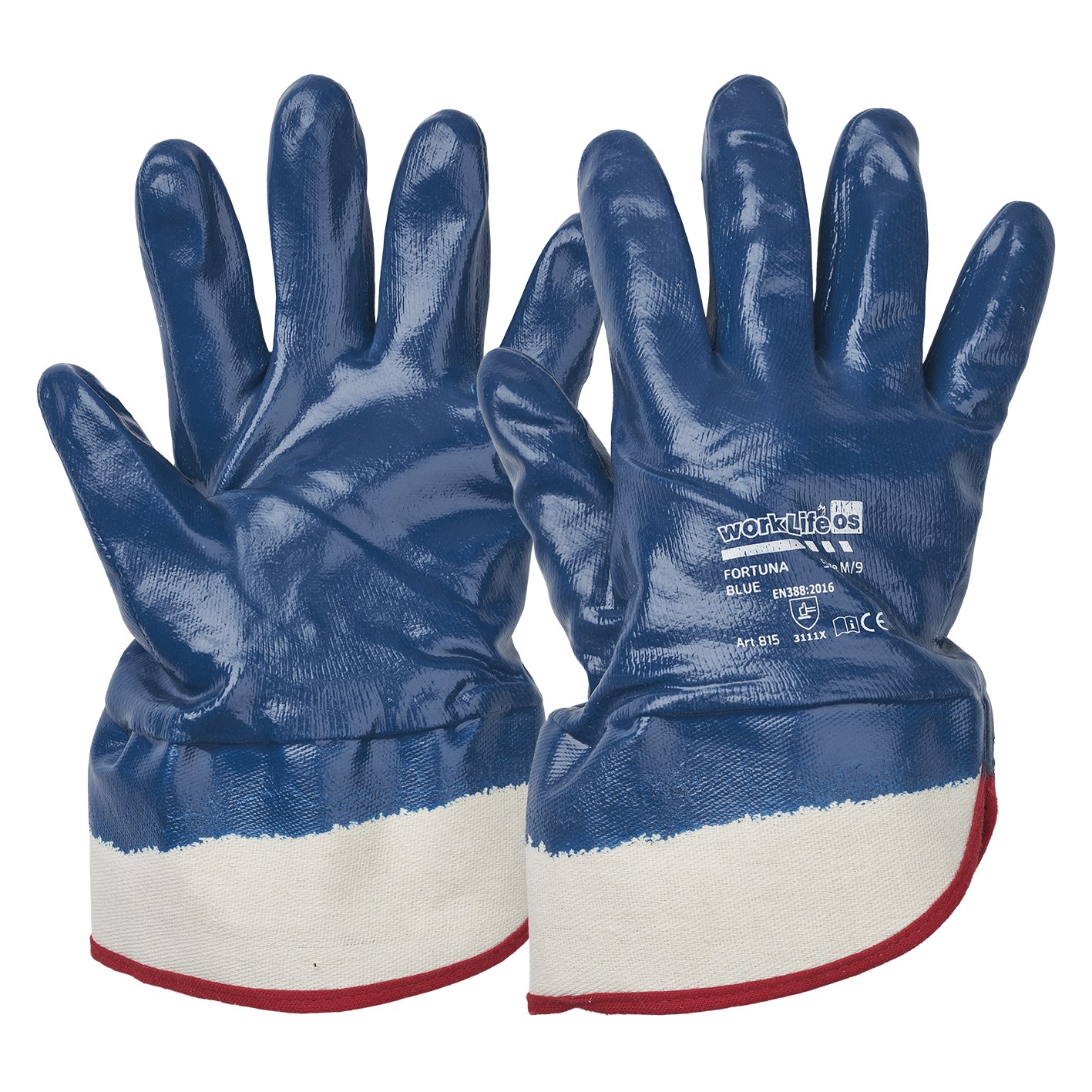Fortuna Blue arbejdshandske med nitril-belægning. Bomuldsbasis med syet manchet. Ideel til entreprenørarbejde og industri.