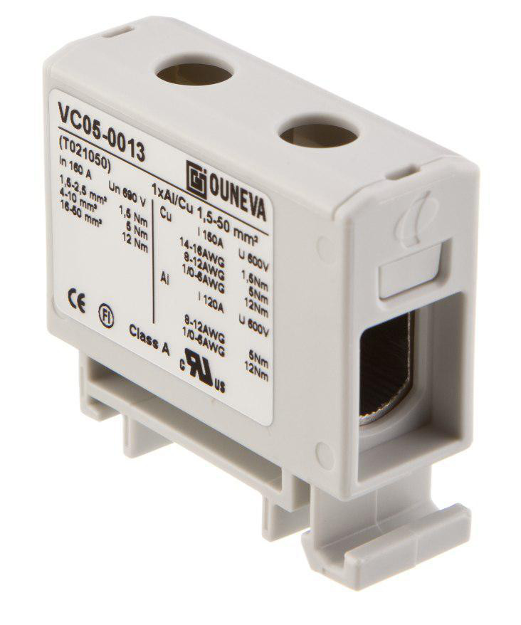 Ouneva OTL universalklemme til sikker tilslutning og forgrening af alu- og kobberkabler. Isoleret design og grå farve.