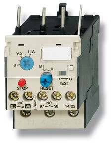 3-polet overbelastningsrelæ (6-9 A) til direkte montering på J7KN10-40, med både manuel og automatisk nulstilling.