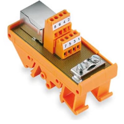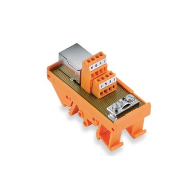Overgangsmodul RS RJ45 fra Weidmüller. Skrue/RJ45 stik for TS35. Ideel til hurtig og sikker dataoverførsel.