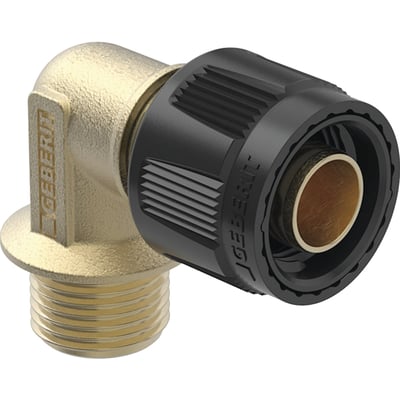 Geberit overgangsvinkel 90° med MasterFix, fremstillet af blyfri rødgods for en sikker installation.