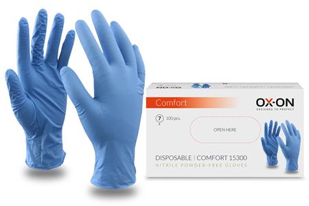OX-ON Disposable Comfort 15300 er en blå, pudderfri engangshandske i nitril, godkendt til kontakt med fødevarer. Den er særdeles komfortabel og elastisk, og tilpasser sig håndens form under brug.