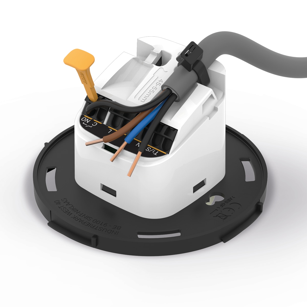 Nikos unikke SnapFit-system sikrer en hurtig og stabil installation i alle typer lofter. Sensoren monteres nemt med en simpel drej-og-klik-bevægelse. De skrueløse og let tilgængelige plug-in terminaler, sammen med muligheden for værktøjsfri kabelføring, gør installationen enkel og effektiv.