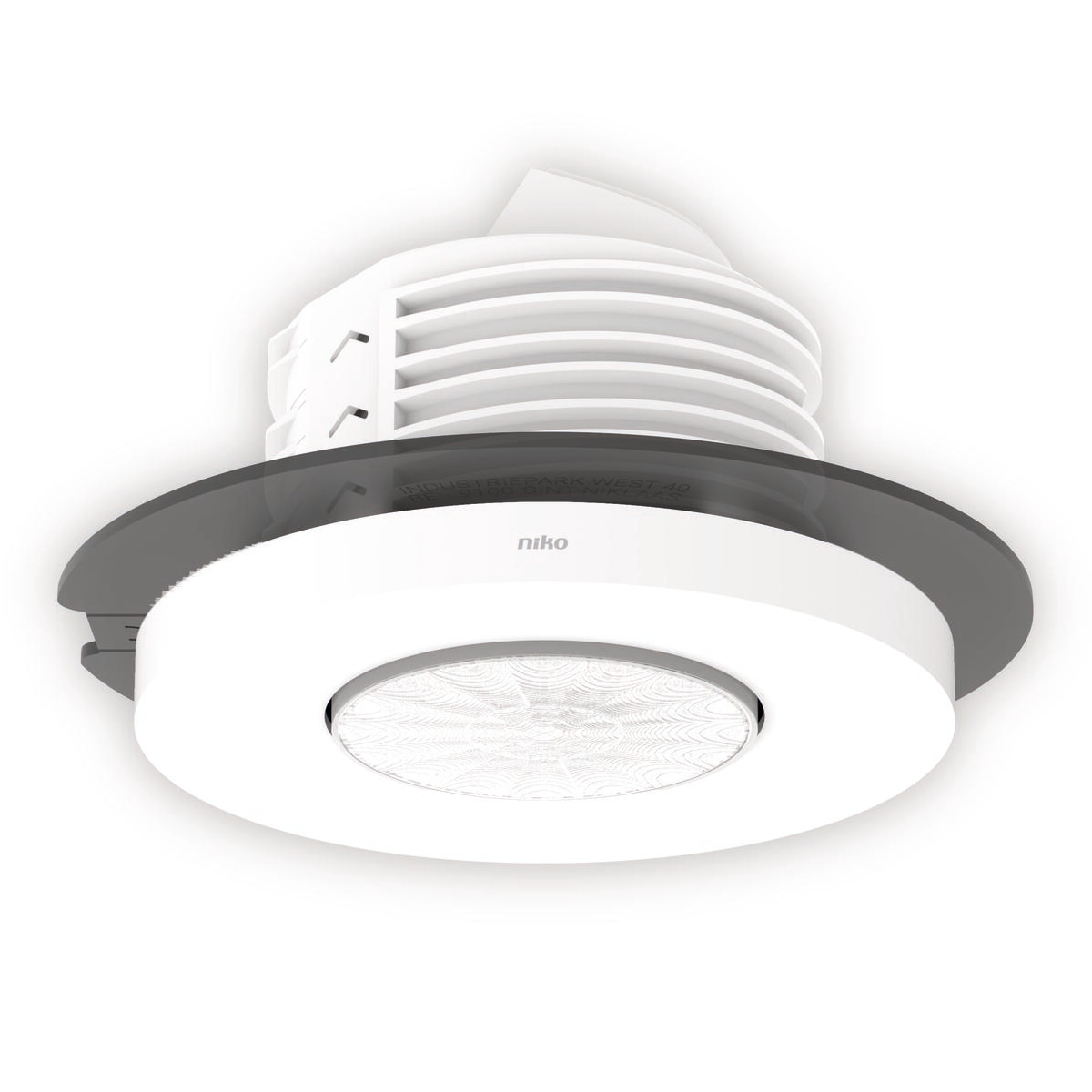 Sensoren har et fladt og diskret design, der falder i ét med loftet og passer ind i ethvert interiør. Farven kan nemt ændres til sort ved blot at udskifte afdækningsringen.