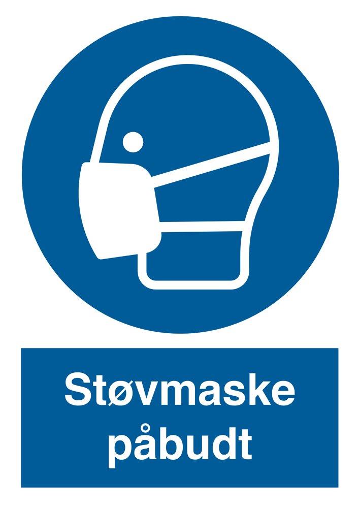 Påbudsskilt med dansk tekst 'Støvmaske påbudt' i plast (A4) størrelse 297 x 210 mm. Symbol og tekst følger DS/EN ISO 7010:2011 standarden.