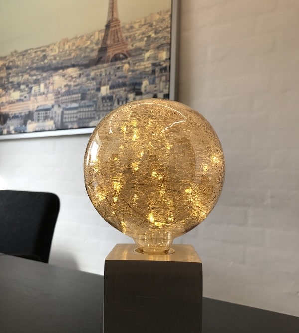 Globepæren Klokkeblomst er designet til stemningsfuld belysning. Med gyldent glas og indbygget mini LED-lyskæde skaber den et dekorativt og hyggeligt gyldent lys.