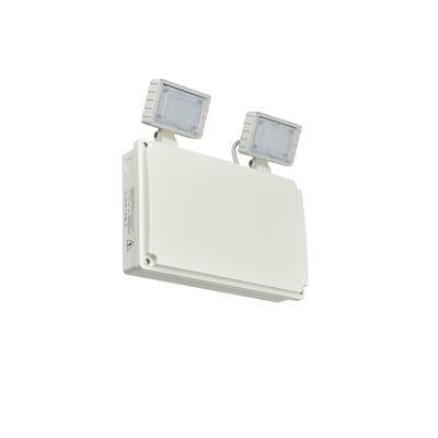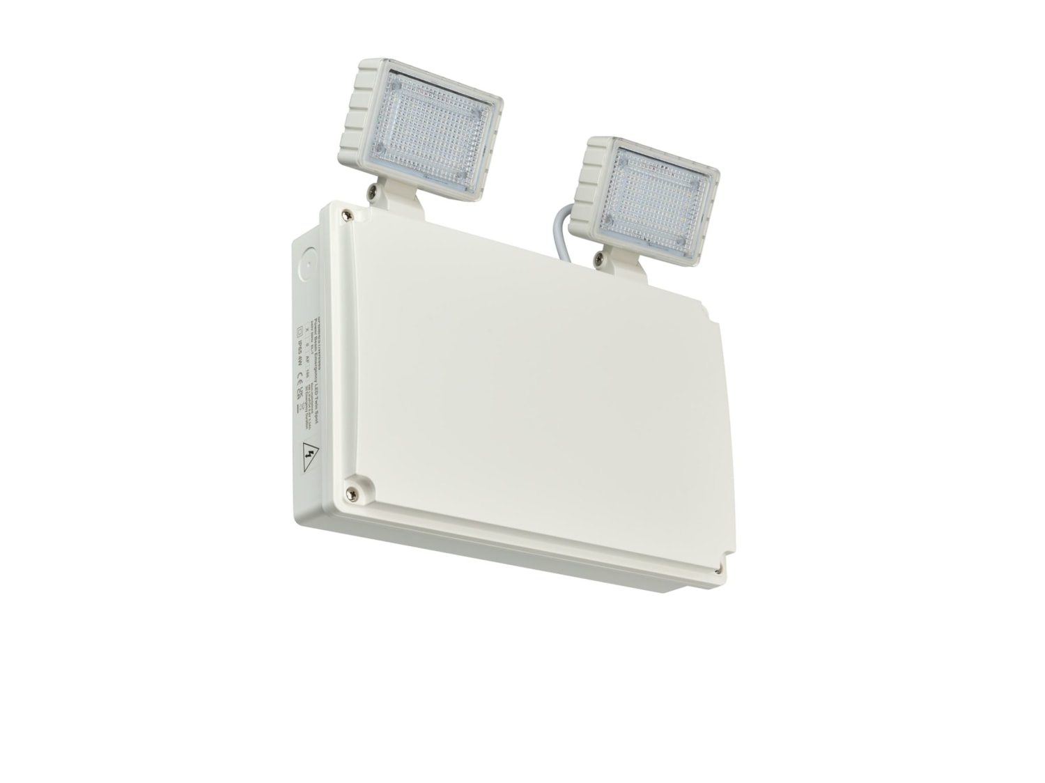 Paniklysarmatur Twin Spot EM164C med 9W effekt, 1140lm lysstyrke og 3 timers batteritid. Hvid finish og manuel testfunktion.