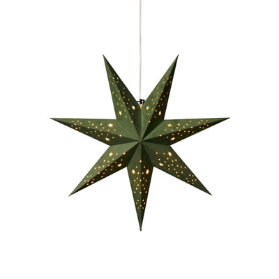 Dekorativ papirstjerne på 60 cm i grønt fløjl med 7 spidser, velegnet til indendørs brug. Leveres med ledningssæt og afbryder.