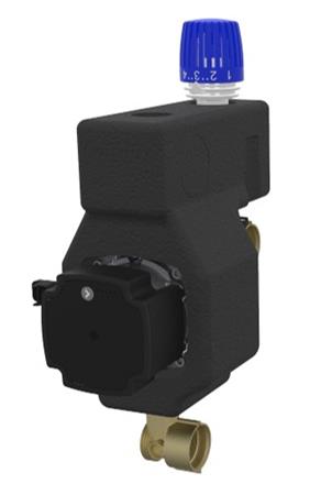 Wavin Comfia parallelshunt med Grundfos UPM3 Auto cirkulationspumpe, termostat 20-70°C, kontraventil, luftskrue, ophæng og isolering.