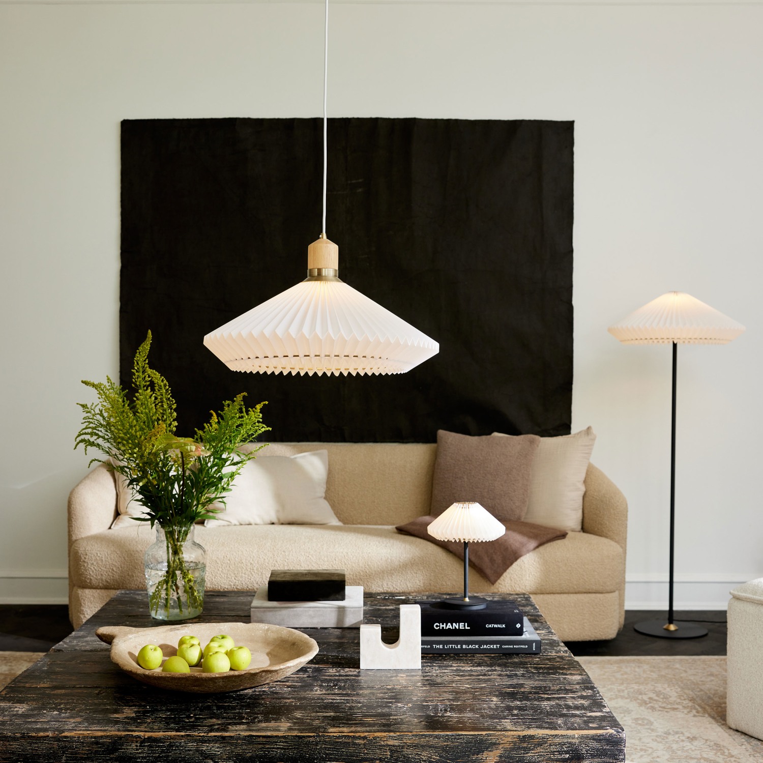 Lampen er ideel til brug på et skrivebord, natbord eller som en dekorativ belysningskilde i stuen. Den er udstyret med en 1,5 meter stofledning og en praktisk afbryder placeret på lampebasen.