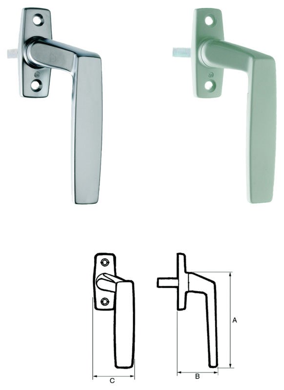 Paskvilgreb i zinklegering med skruehuller (43 mm centerafstand). Dimensioner: A = 95, B = 41, C = 44. Skruediameter: 4 mm.