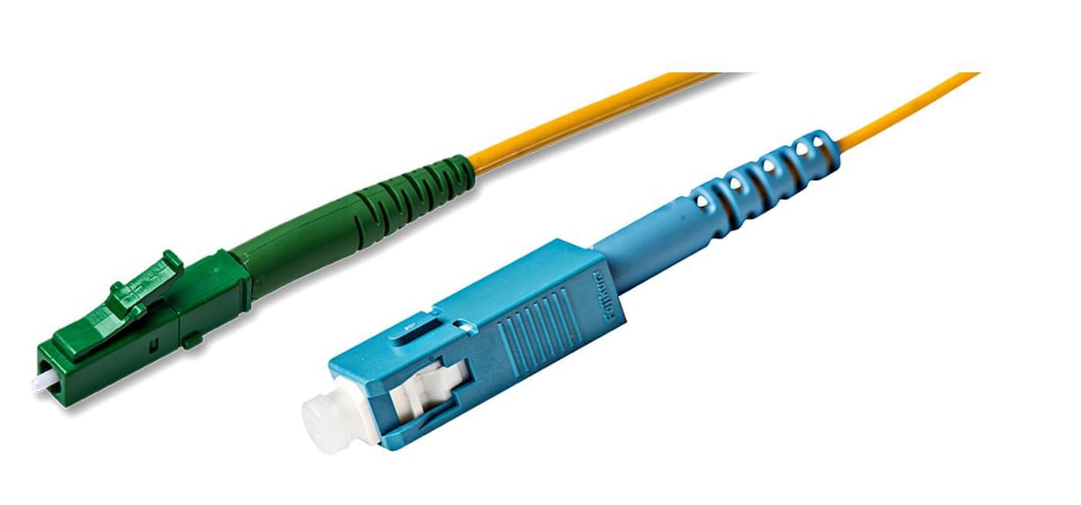 Fiberoptisk patchkabel LC/APC til SC/UPC, SingleMode 9/125 m G657A, Simplex, 2mm LSZH kappe, gul, 15m.