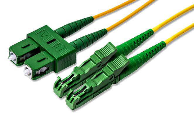 Fiberoptisk patchkabel SC/APC til E2000/APC, SingleMode 9/125 m G657A, Duplex, 2mm LSZH kappe, gul, 5m.