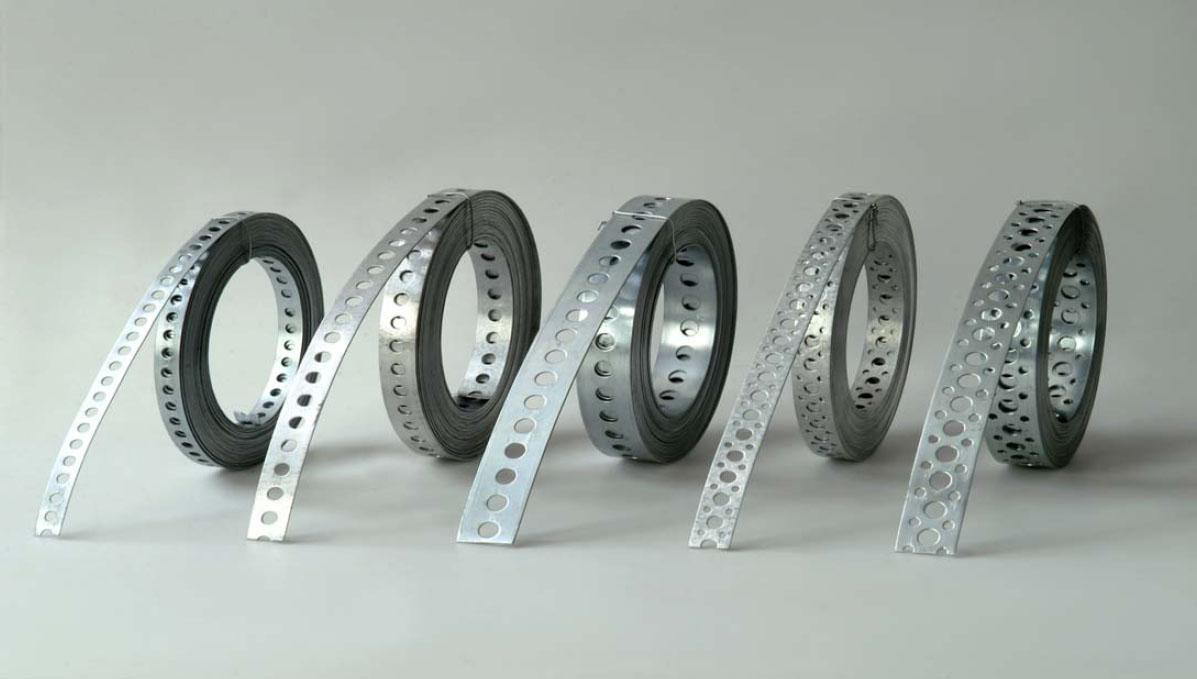Patentbånd i galvaniseret stål til fastgørelse og ophæng af træ, rør m.m. Leveres på en rulle af 25 meter.