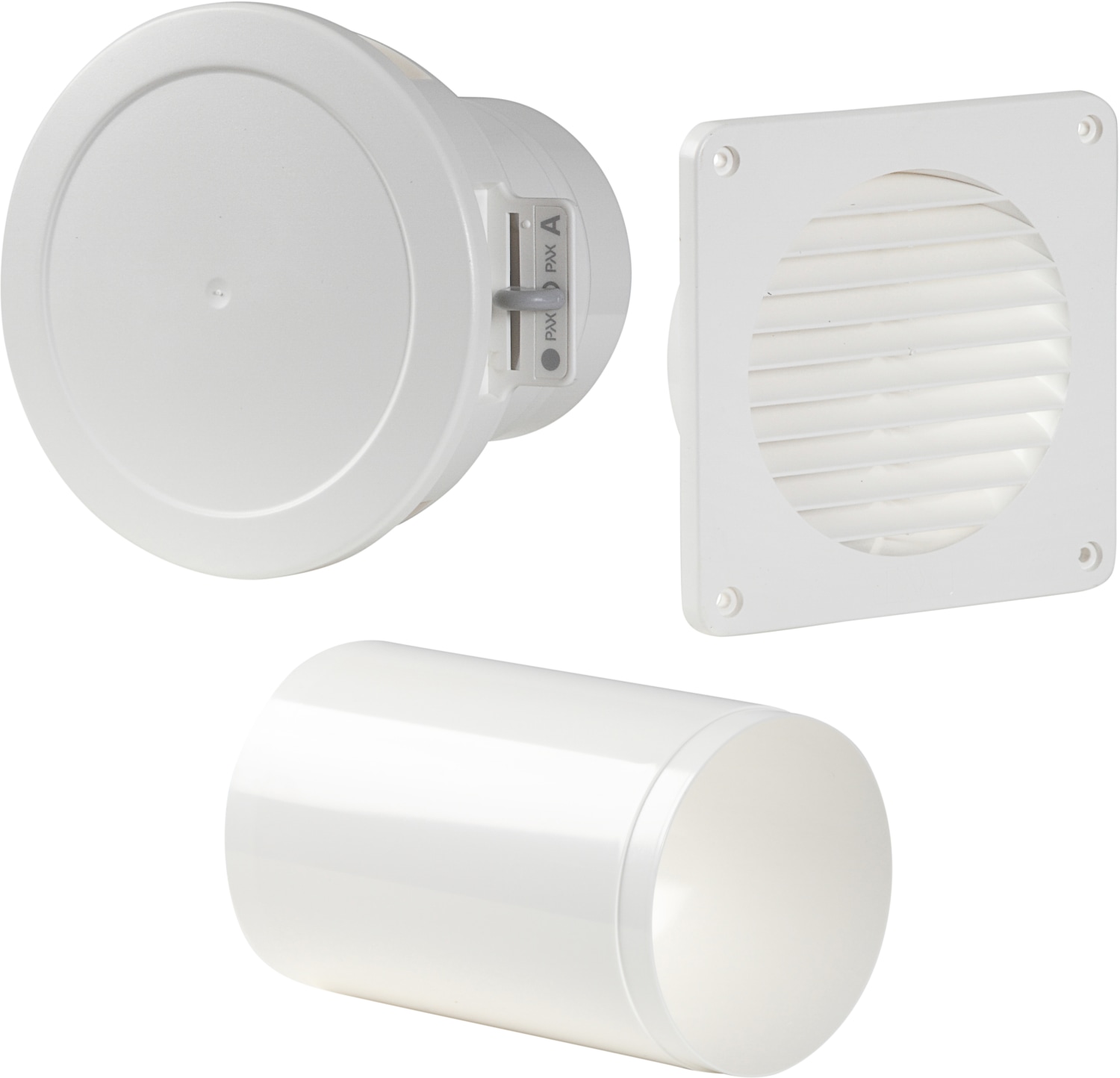 Ventilationssæt fra Pax, justerbar længde fra 100-370 mm. Passer til Ø102 borehul og har en diameter på Ø110. Fremstillet i hvid plast.