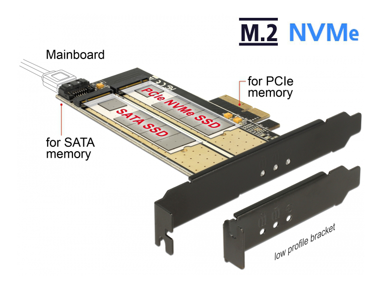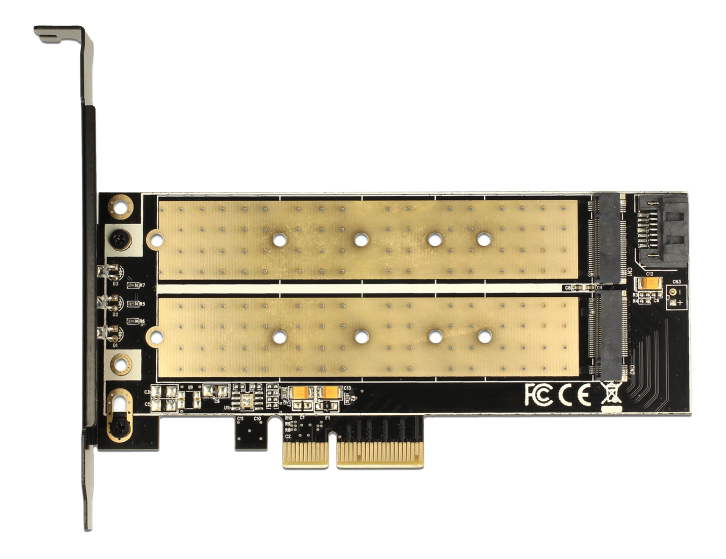 Dette PCI Express kort fra Delock udvider din PC med to M.2 slots. Kortet giver dig mulighed for at tilslutte et M.2 SATA modul i formaterne 22110, 2280, 2260, 2242, 2230 via et SATA kabel til bundkortet. Derudover kan et M.2 PCIe modul i samme formater tilsluttes.