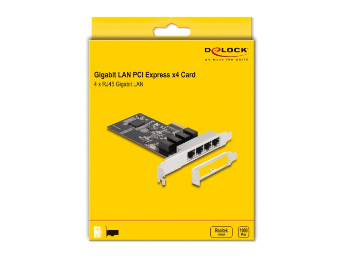 PCI Express kortet fra DeLock tilbyder fire netværksporte med en dataoverførselshastighed på op til 1000 Mbps.