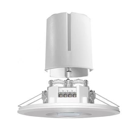 Denne design-tilstedeværelsessensor er udstyret med fremragende detekteringsevne, der dækker et område med en diameter på mindst 8 meter. Den flade optik er udstyret med design-afdækninger i kunststof, som er runde og hvide, men kan udskiftes med alternative design.