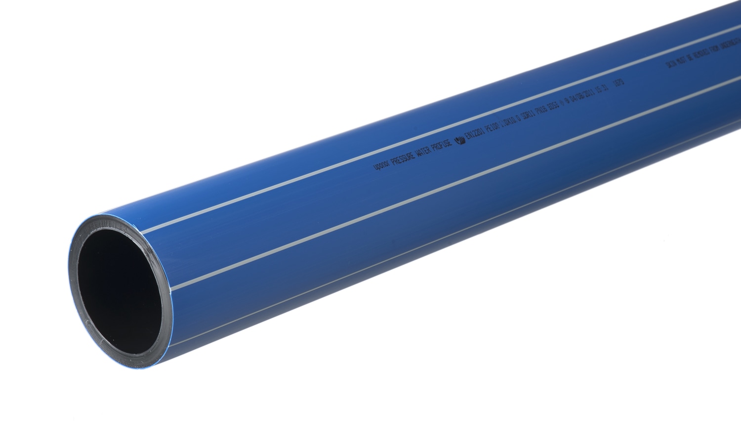 Uponor Profuse kapperør i PE100RC materiale. Diameter 63 mm, PN10 trykklasse og SDR17. Leveres i blå med hvid stribe, 6 meter.