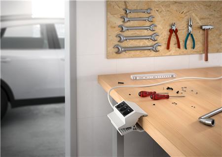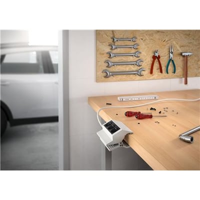 PEGGY 3-stikdåse med klemme i hvid. Nem at montere og anvende til mange formål i skoler, værksteder og konferenceopstillinger. Med 3 skråtstillede Schuko udtag.